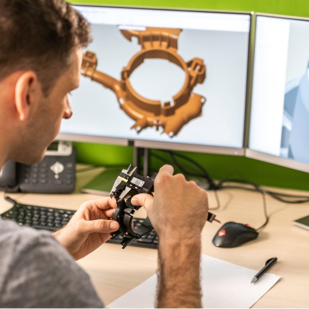 Fabricação de protótipos funcionais e visuais por impressão 3D.